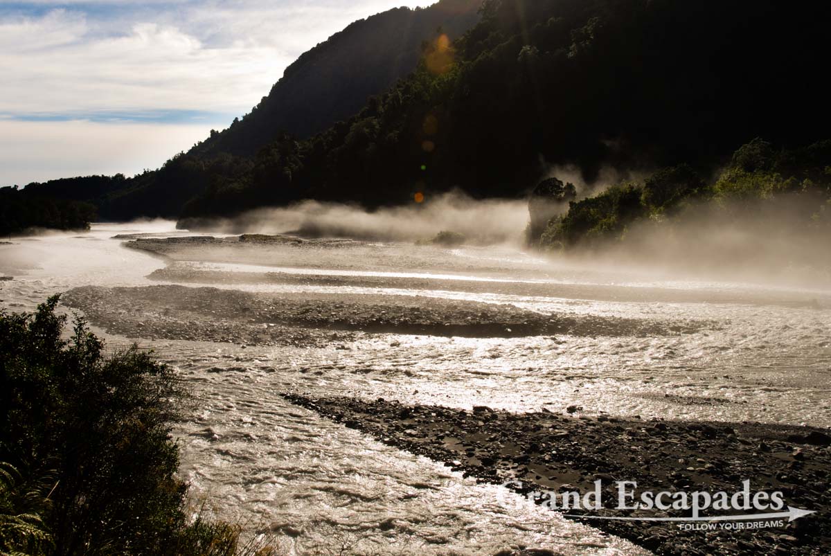 Staying at Backbackers “Chateau Franz” in Franz Josef Village was a disappointing experience. Talking to the Australian couple sharing the “Ski Hut” with us remains the only the pleasant memory we have of that sad place. The village is a short string of businesses that sleep, feed and entertain tourists or take them on helicopters over the glaciers providing a permanent noisy coulisse.