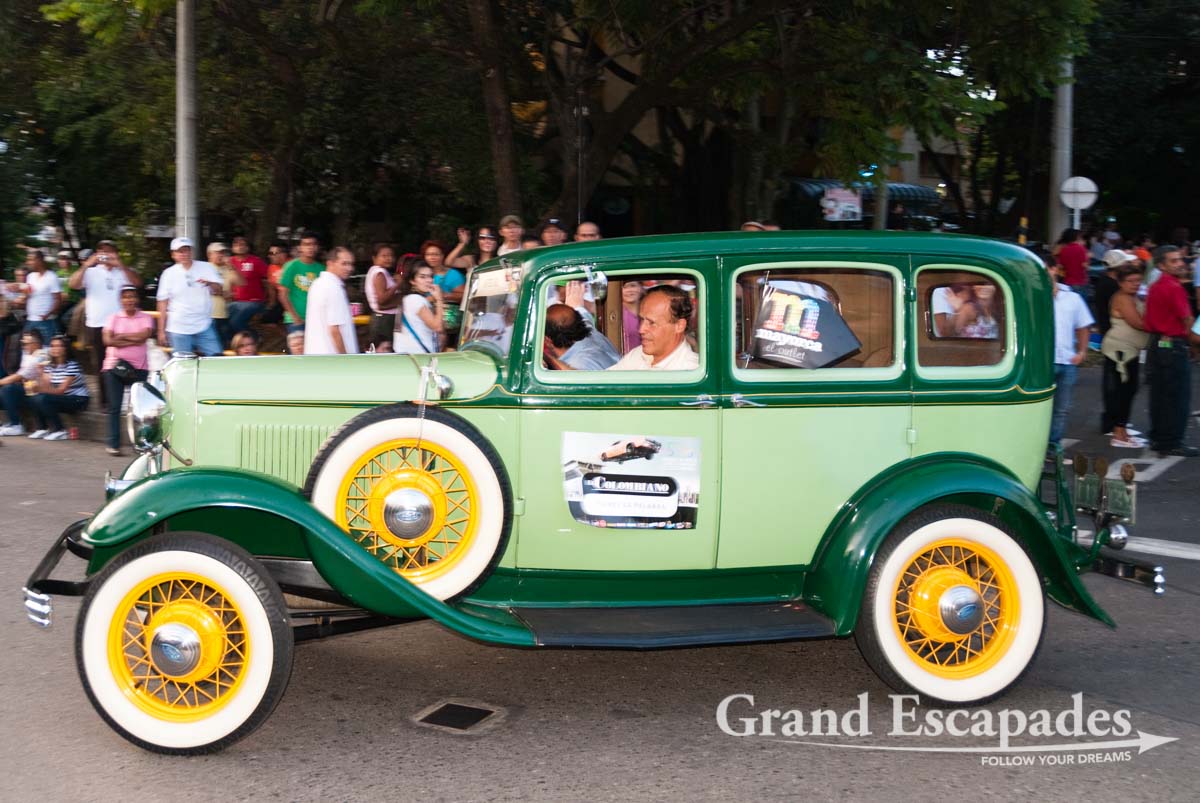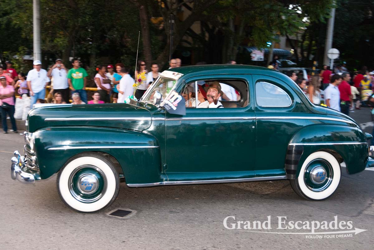 Saturday, a convoy of 200 vintage and other cars circled the main streets of town, its passenger dressed appropriate to the age of the automobile. No need to worry about a spot to watch, since its routine extends though a large part of the town. On Sunday, the last day of the festival, decorated Chivas took the streets, full of cheerful folks. Large spray cans are used by people inside and outside the Chivas to cover each other with foam.