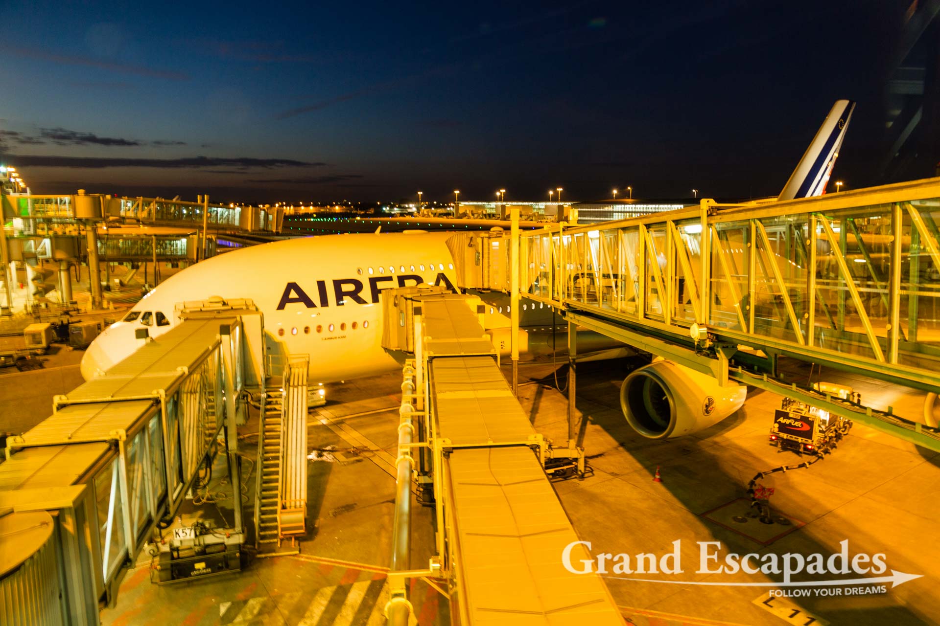 Not that we got there any sooner, flying in the gigantic Airbus A380, but it was a great experience! Something that Gilles had wanted to do for a long time. The check-in in Paris was already quite a sight. Try to picture 516 passengers getting on board at the same time. To be honest is was very orderly, different utopian looking gateways, one for each class, take the passengers inside.