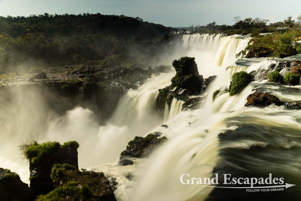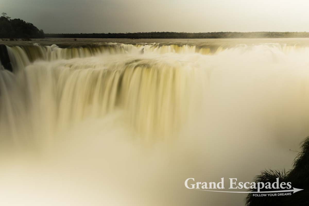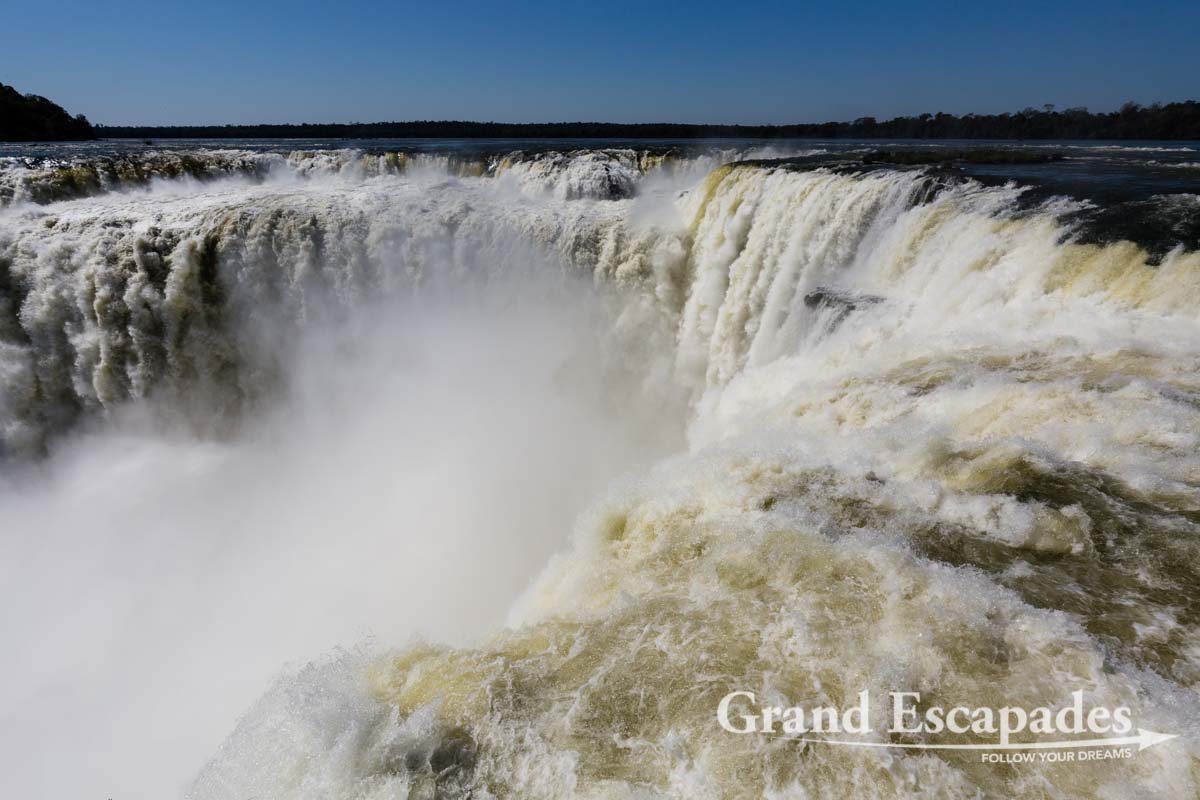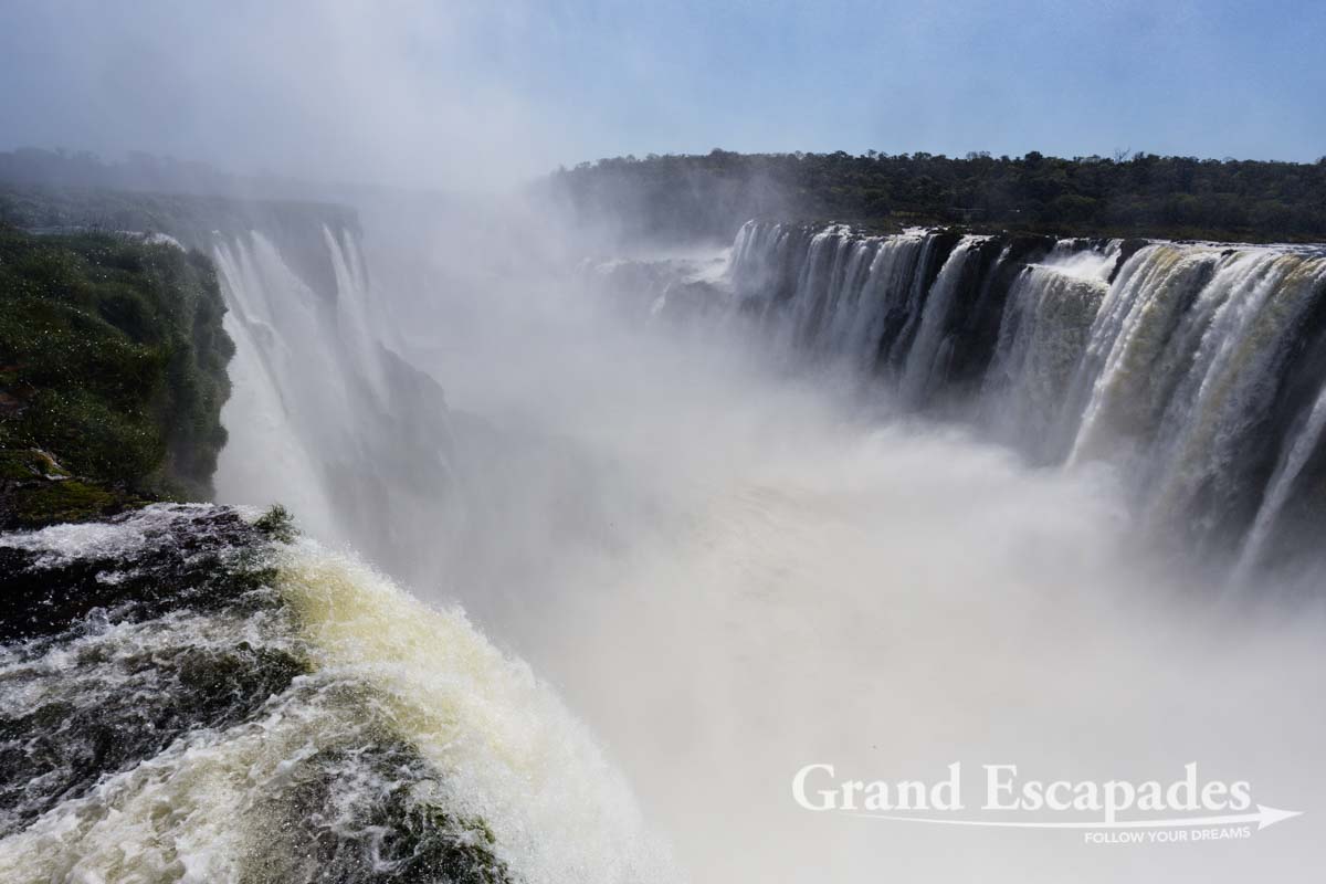 The view from “Garganta del Diablo” is simply breathtaking! Incredible amounts of water are rushing by, their spray providing a good shower to visitors, but also leaving layers of water on the lenses of the cameras (hence the importance to go there in the end). The noise from the huge masses of water plunging down is so loud that it is difficult to talk.