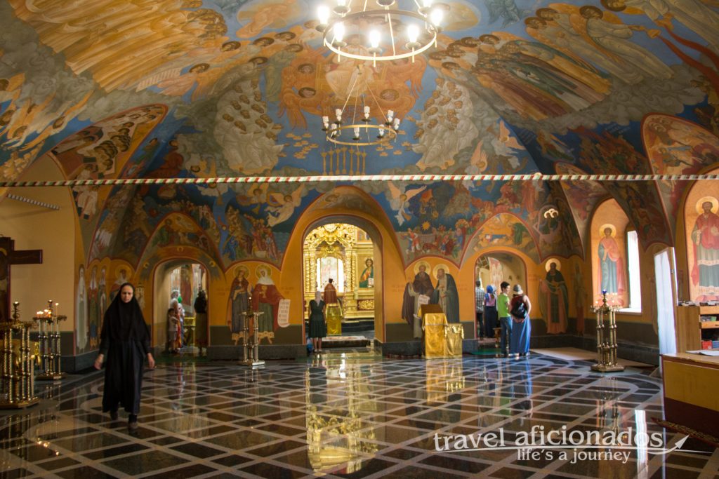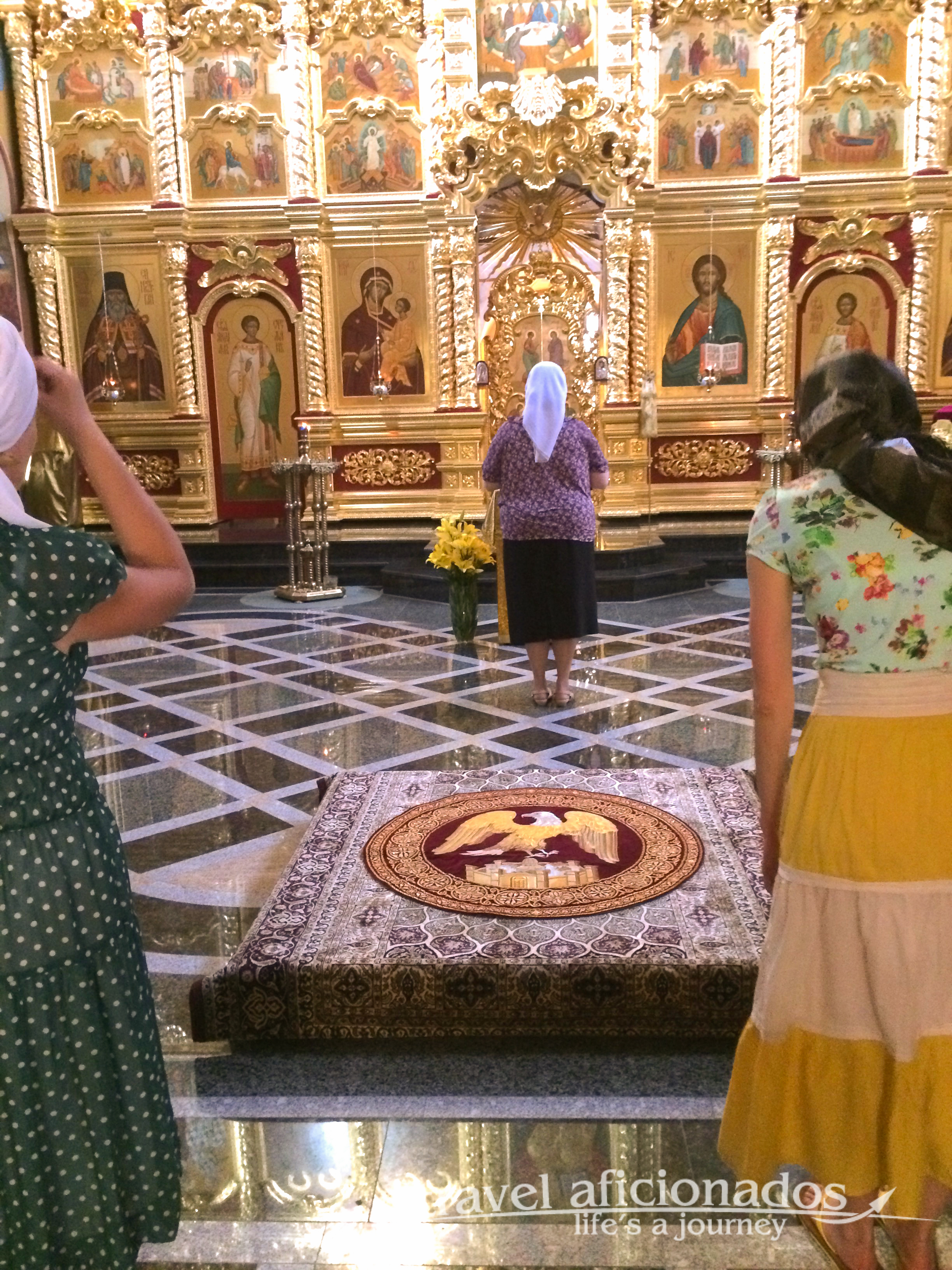 The Green Line takes you to beautiful churches with their onion-shaped domes shining brightly in the sun. The interior is often rich, especially the altars are decorated with plaited gold. In all churches you find a box with light scarves near the entrance and I noticed that all Russian women covered their head while in church.