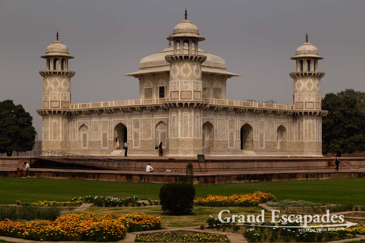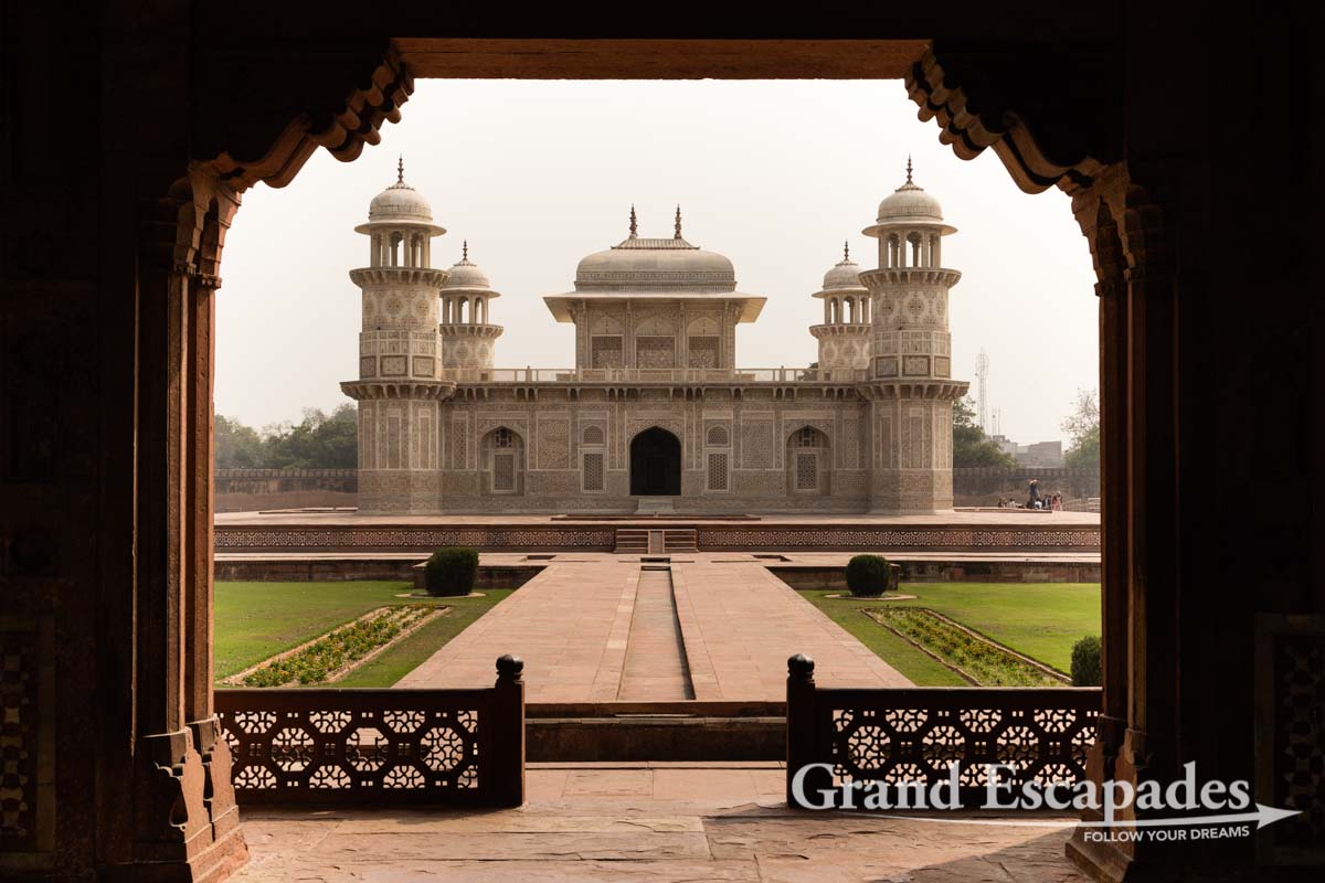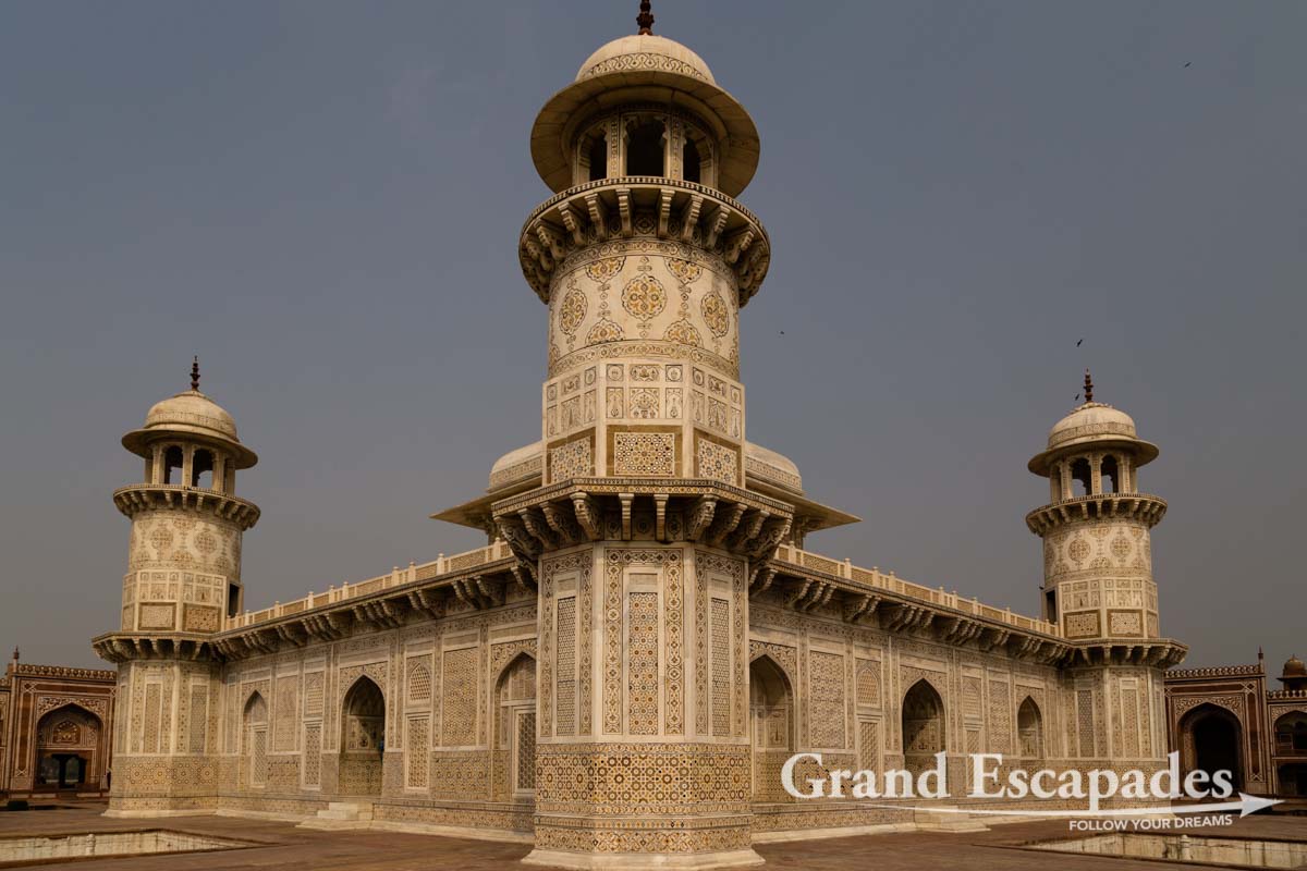 Itimad-ud-Daulah, also called the “Baby Taj”, sits on a small platform, all white, with the most delicate inlay work: tiny chips of semi precious stones creates the most outstanding patterns. The atmosphere shortly before sunset and the incredible quietness there are truly unique…