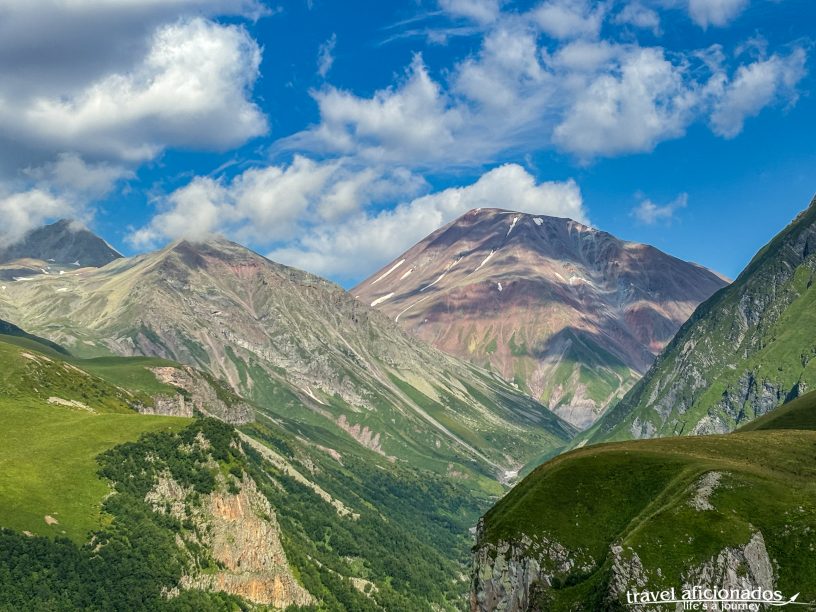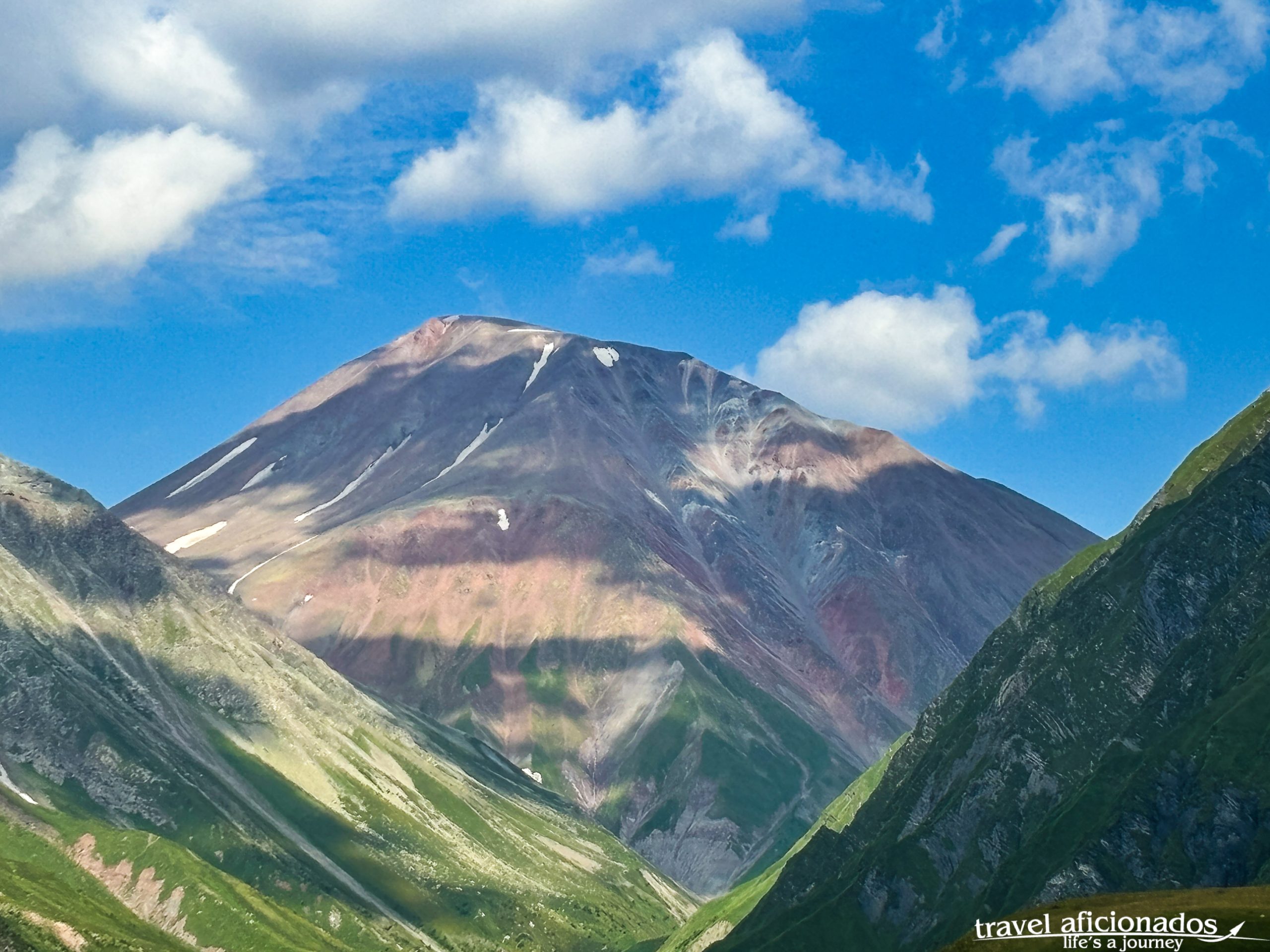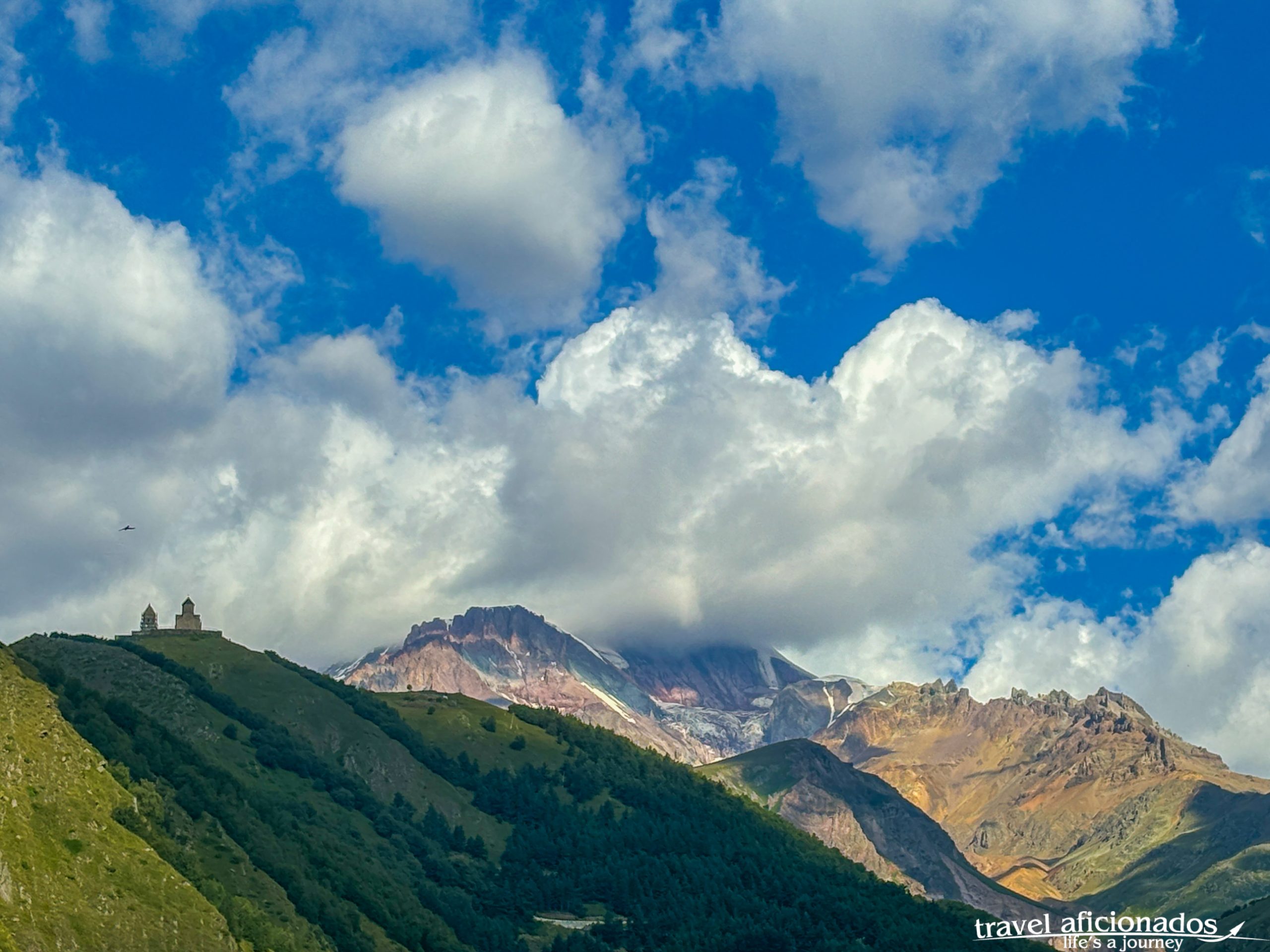 To get a good glimpse of the Caucasus Mountains in Georgia, Kazbegi is your place, only a few hours drive from Tbilisi. The trip along the Georgian Military Highway alone is an attraction, the closer to Stepansminda, the windier the road got. Stepandsminda is the tourist hub, where everything starts and ends. The mountains around Kabezi are majestic, lots of grassy slopes, but also a lot of barren landscape. The road is packed with trucks going to Russia, via Vladikavkas and even further on to Turkey.