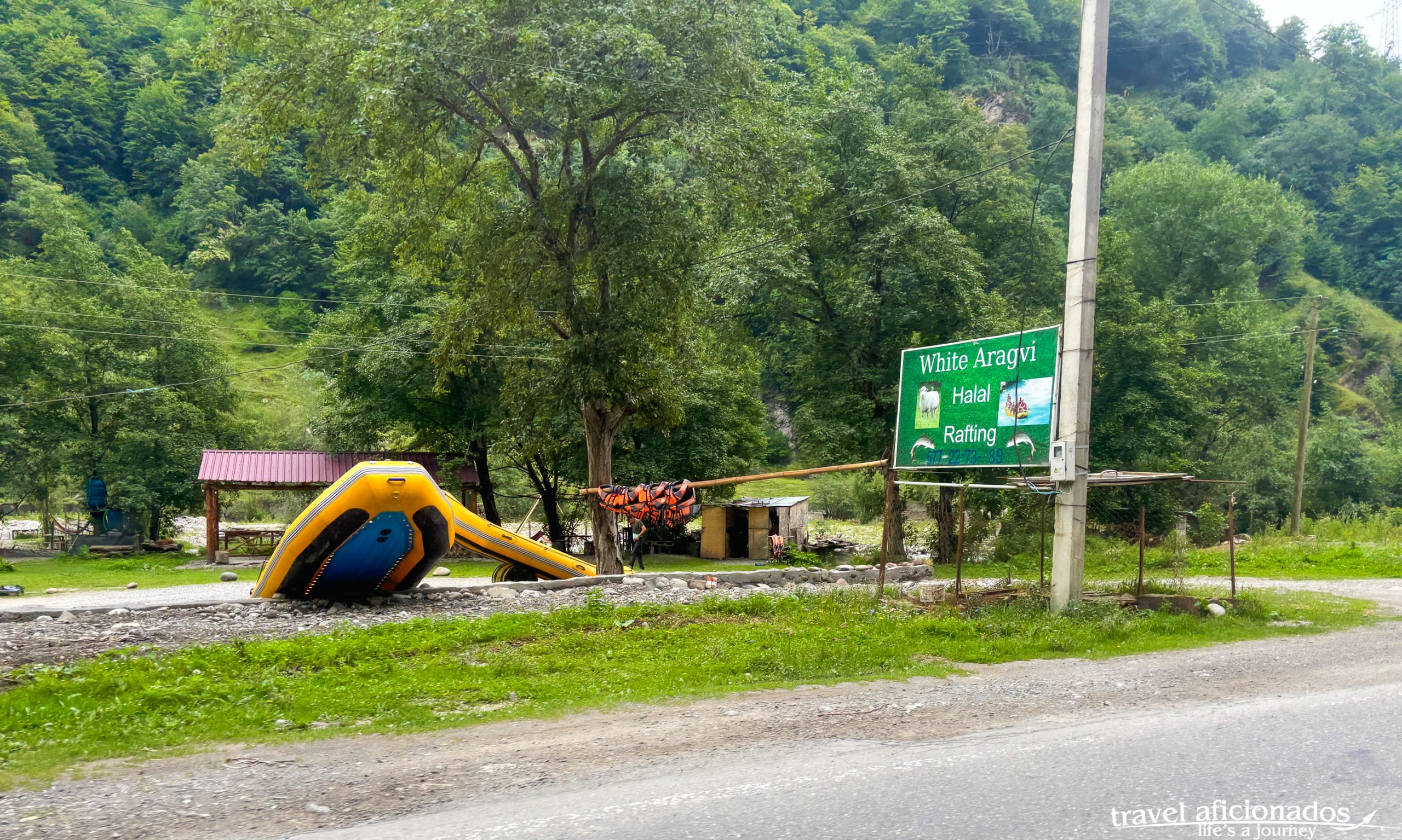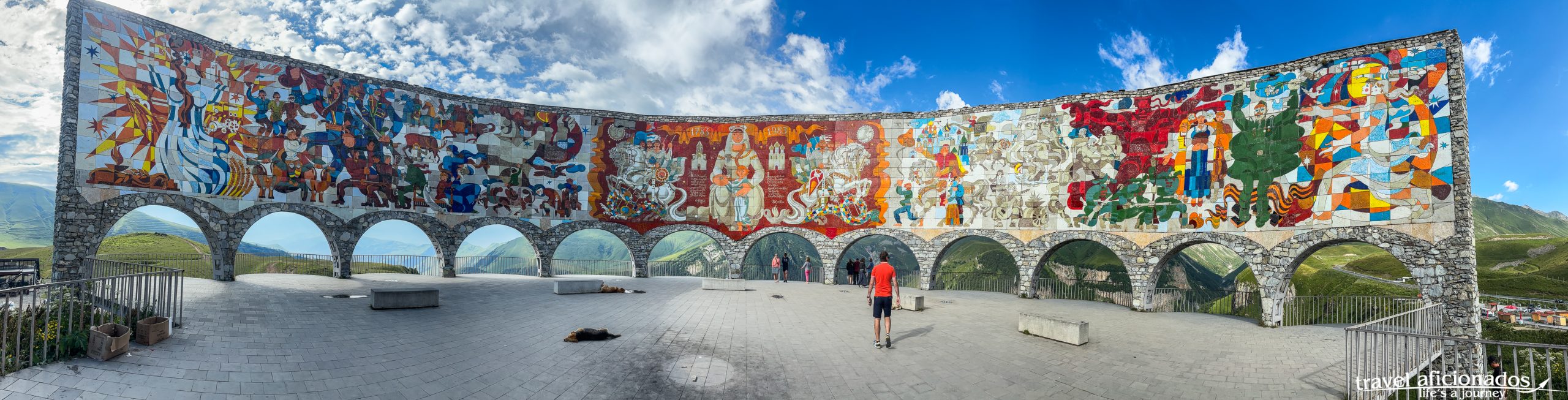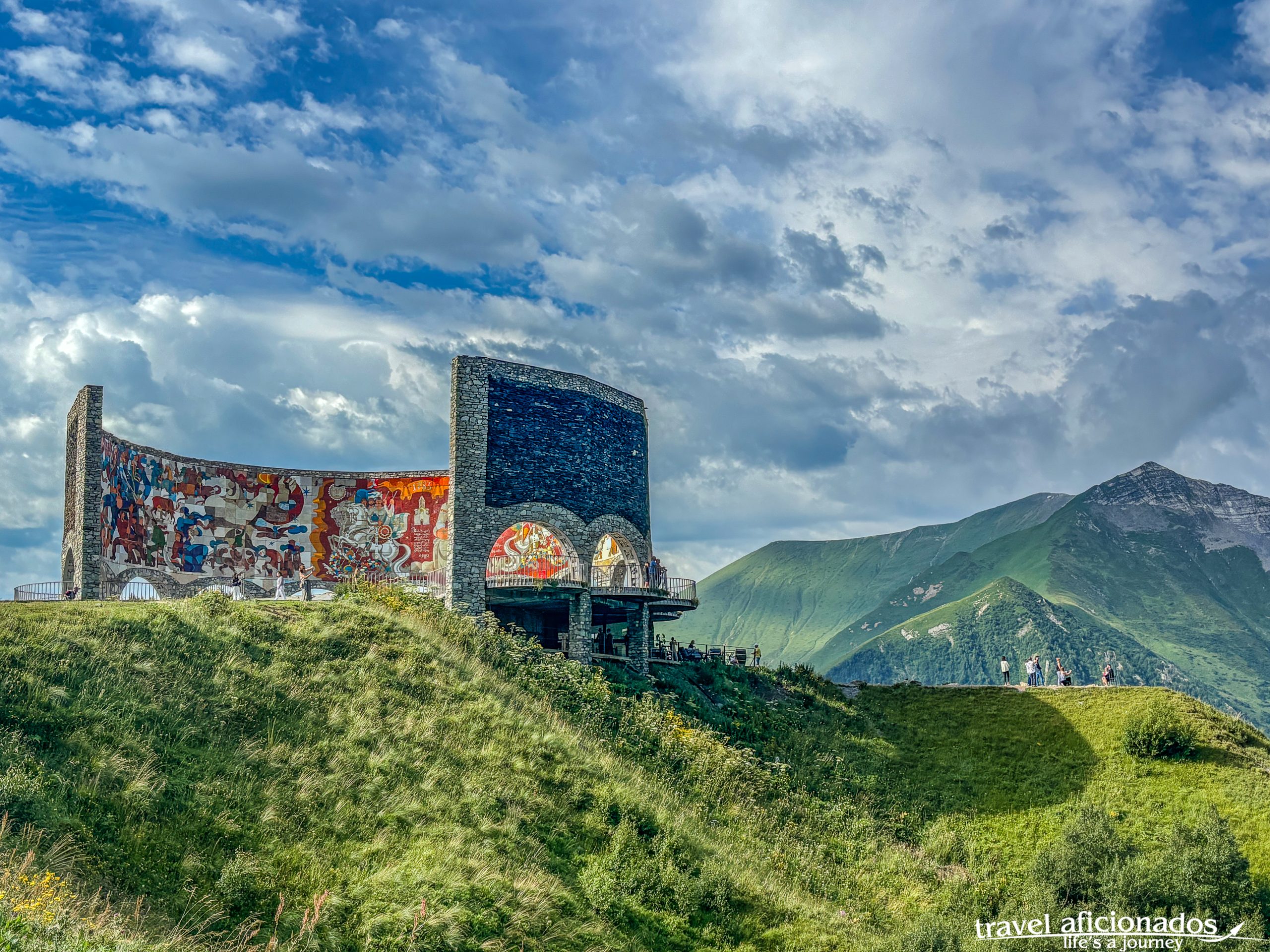 A few kilometers from Stepandminda the Georgian Military Highway passes the Georgia Russian Friendship Memorial. Everybody stops to take photos, since the view of the surrounding mountain is breathtaking. Knowing about the current relationship between Russia and Georgia, the name seems like a joke.