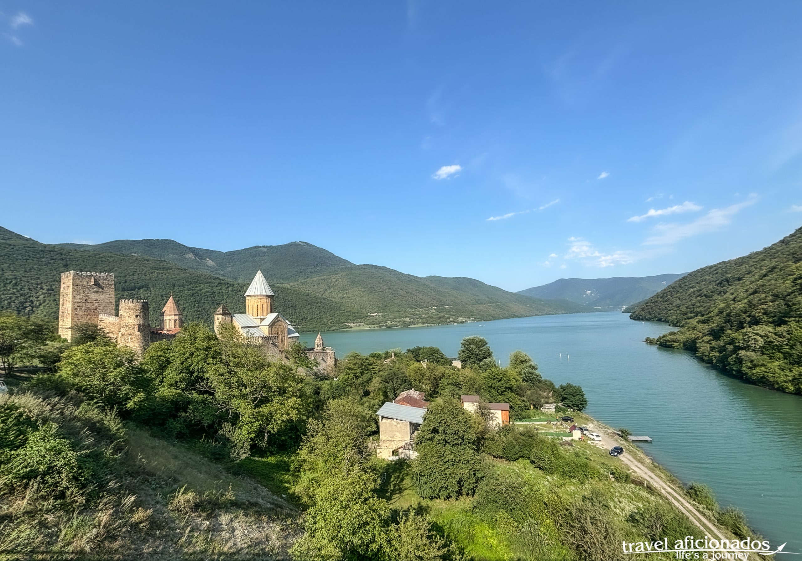 From Tbilisi the city of Stepandsminda (to confuse tourists it is also called Kazbegi) can easily reached by marshrutkas, which cost next to nothing. But we invested 300 GEL (100€) in a taxi, because we wanted to stop at various places on the way from Tbilisi to Stepandsminda. How to find such a taxi, just keep asking taxi-drivers in Tbilisi. The first stop on the trip to Stepansminda was Ananuri Fortress, a fortress of the feudal era (XVI-XVIII centuries) on the Aragvi River.