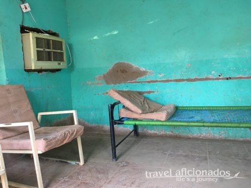 Entering our room felt like slipping into a highly-secured container, a medal door led to little “antechamber”, from there another metal door led into a very basic bathroom and the third door into our room. We would not have minded the peeling paint and the spider webs, but a mattress only covered by a smelly woolen blanket was a bit much. We tried not to touch anything and slipped in our silk sleeping bags. There was an ancient TV which we did not touch, since it was covered with dust.