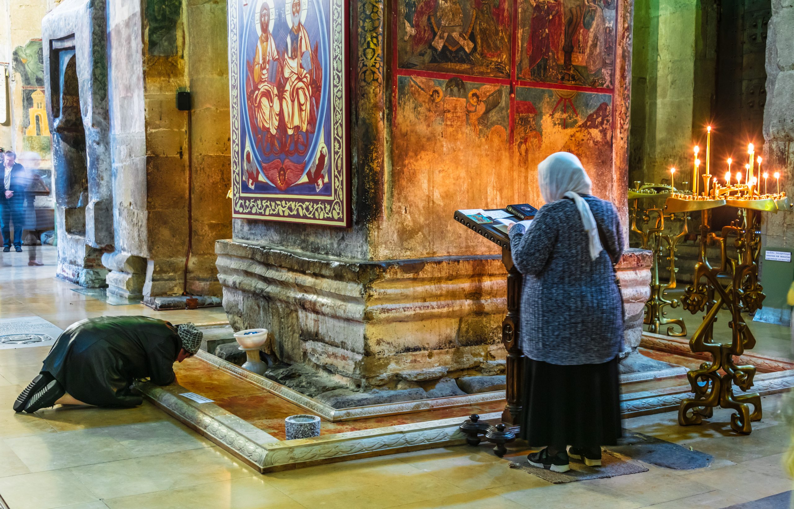 Woman praying in Svetitskhoveli Cathedral in the historic town of Mtskheta, Georgia