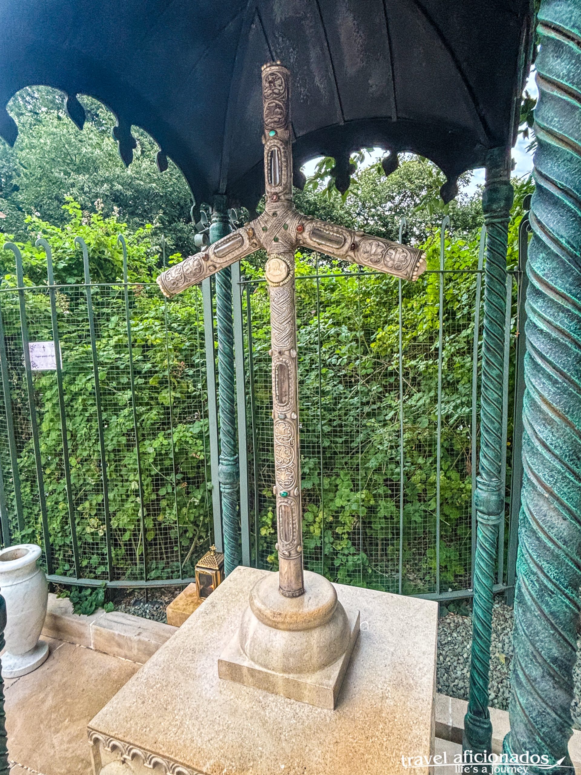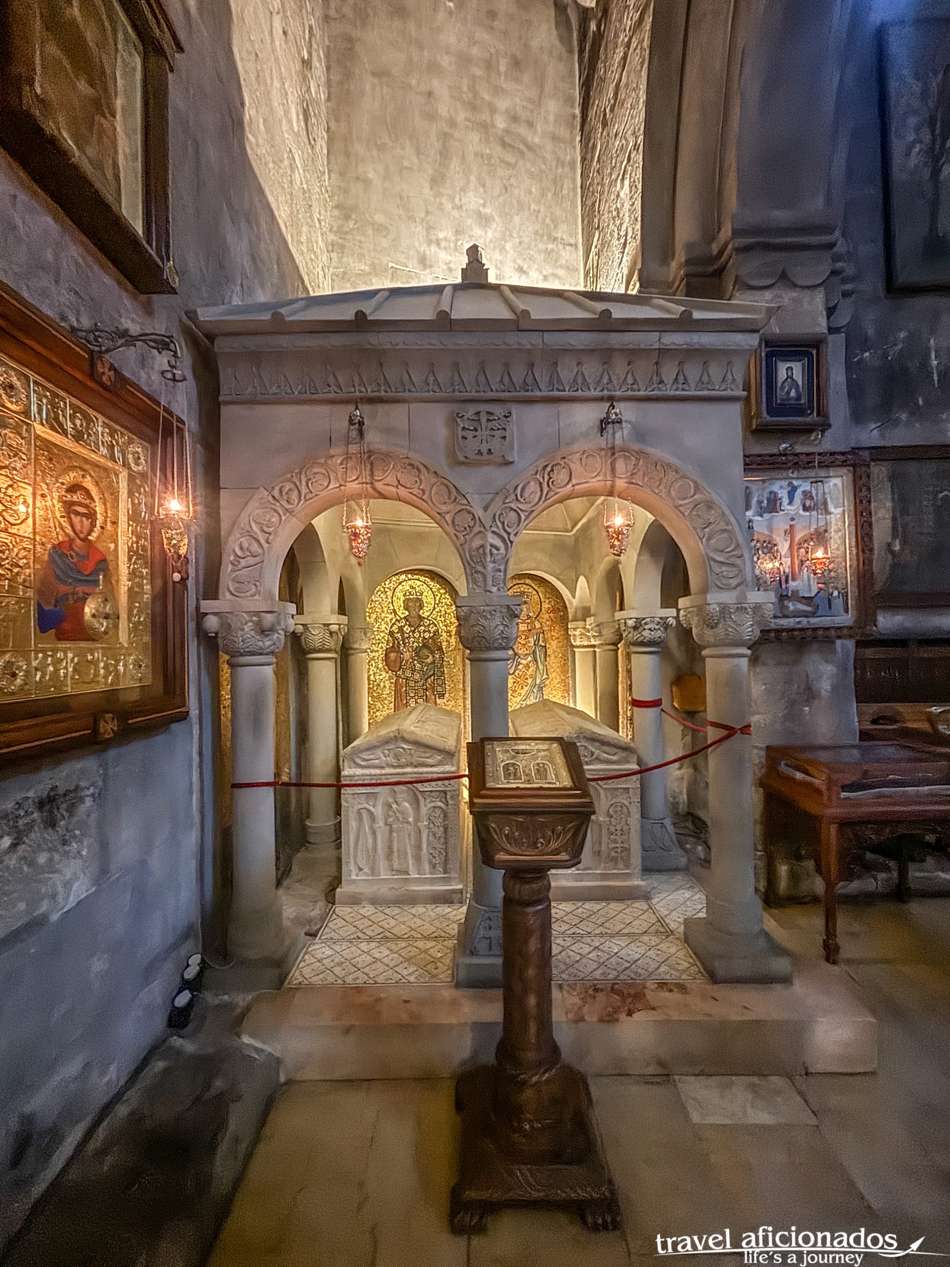 King Mirian and Queen Nana are also buried at this church. You can see their twin stone sarcophagi housed in a small stone pavilion at the opposite corner of the church. Two exquisite glass and stone mosaics hang above the graves.
