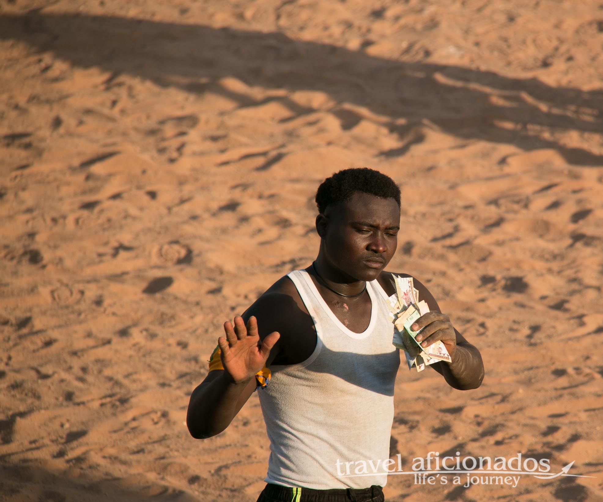 More and more people arrived, men only, Kelly and I pretended to be used to such an all male environment. Once the stadium was filled to the rim, this is meant literally, a prayer started. Soon an elderly man was beating a drum to get the crowd going before wrestlers filed in the sandy arena dominated by a huge referee.