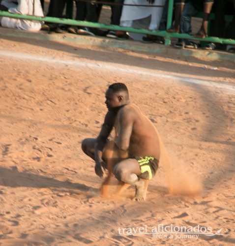 Each wrestler went over to the sector where his fans were cheering in the stands and finally the first two wrestlers faced each others. The fight is quite ceremonial: throwing sand on ones own body, bending in the hips and moving in circles around the opponent, slapping his head, holding his leg and then a quick move. Voila!