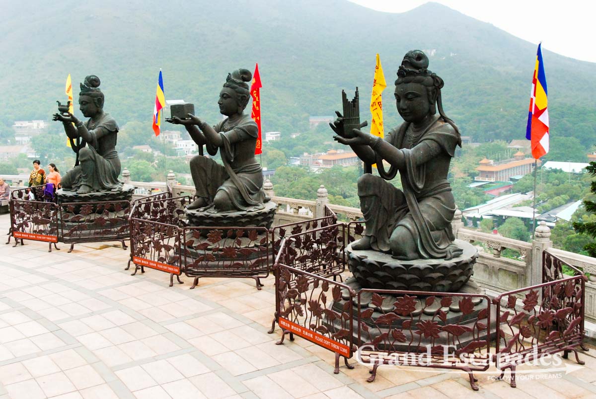 “The world’s largest outdoor seated bronze Buddha sits serenely atop Ngong Plateau”… This is the official tourism ad for this place on Lantau. Do not expect a quiet place, this is a major attraction for both Chinese and non-Chinese tourists! But it is truly impressive.