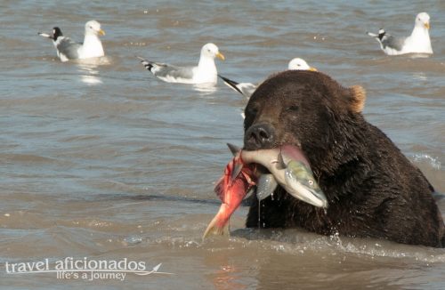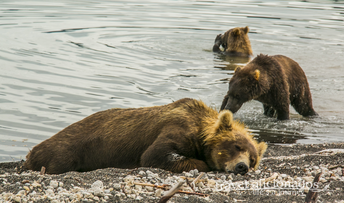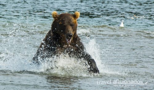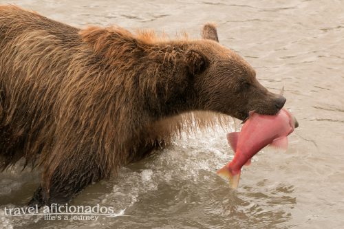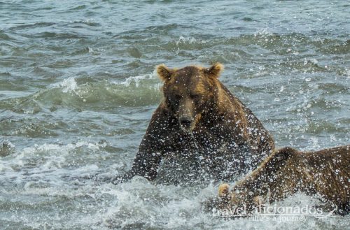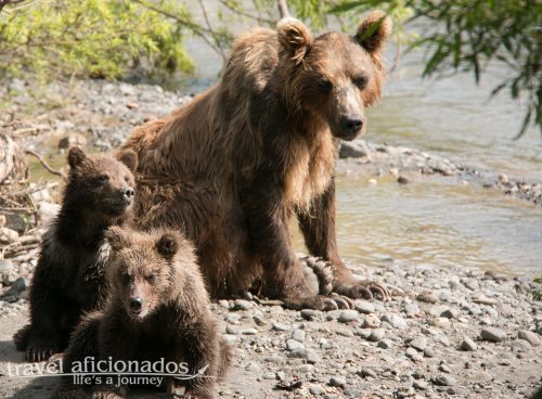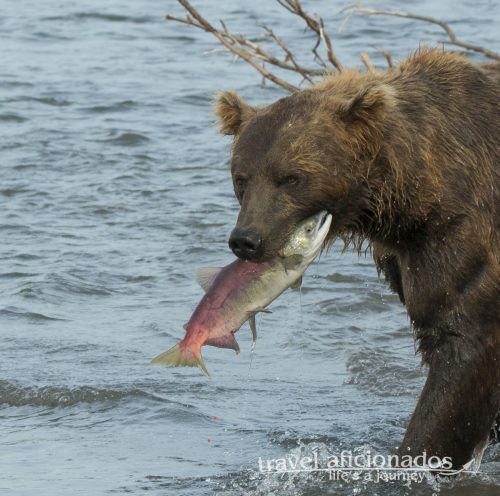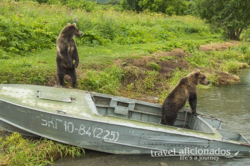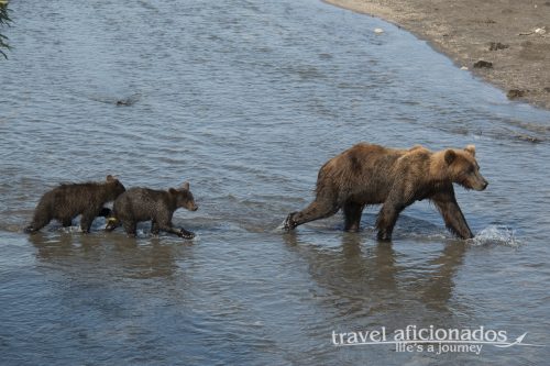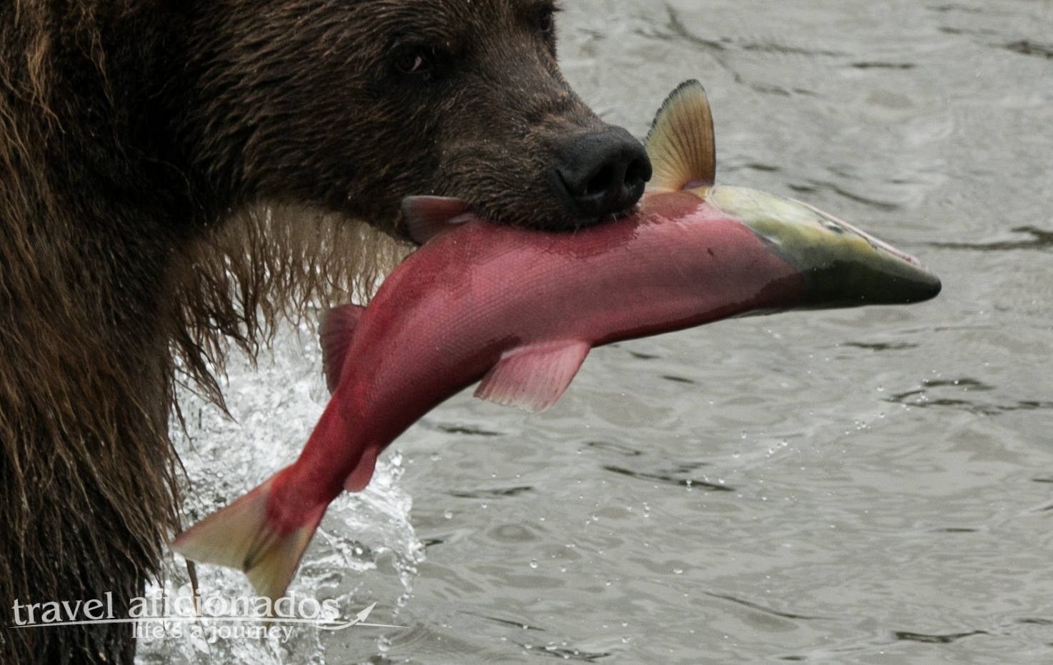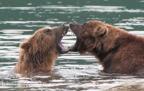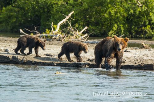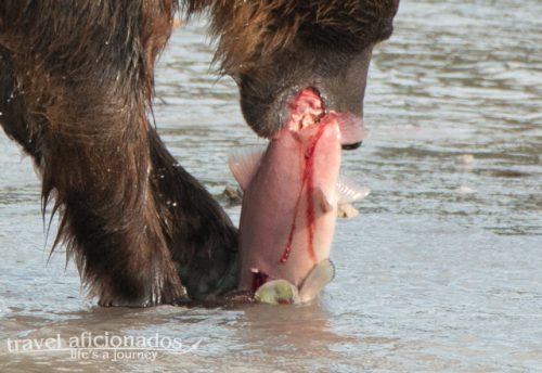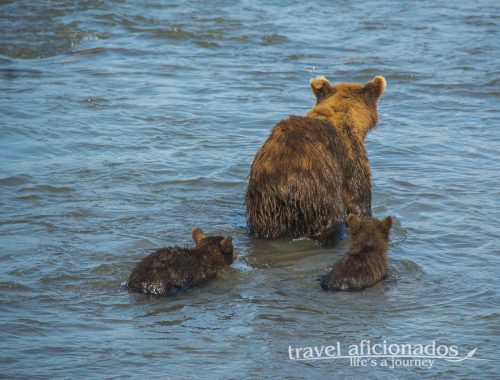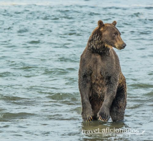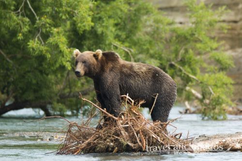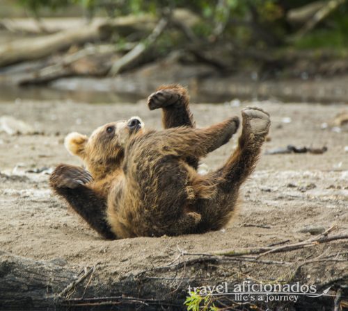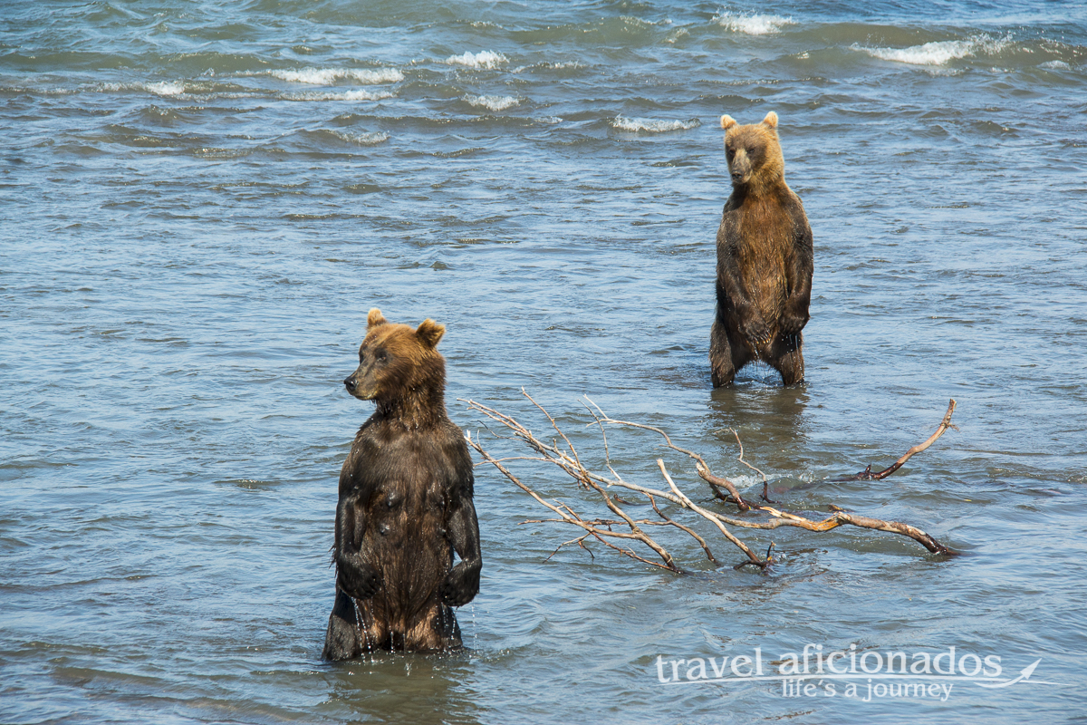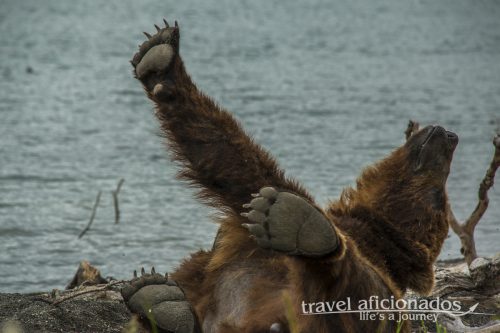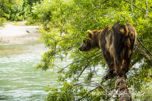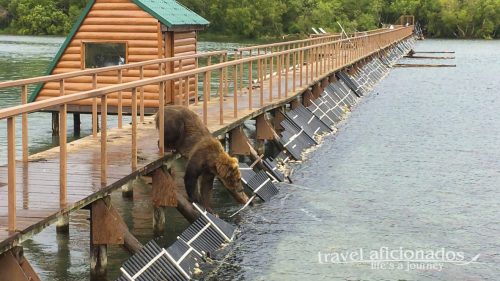 - To get a better view of where the salmons are the bears stand up or climb on wood trunk