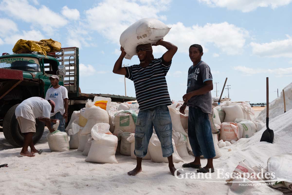 Before heading to Punta Gallinas, the very tip of the Guajira Peninsula and the northernmost point of South America, we turned north to the salt fields of Manaure, the biggest “Salinas” on the peninsula. There, the salt is collected in artificially made pans. In the nearby plant it is cleaned from sand and then piled up in a huge pure white mountain, a majestic sight. It is finally scooped into bags of approx. 50 to 60 kilograms and then heaved onto trucks.