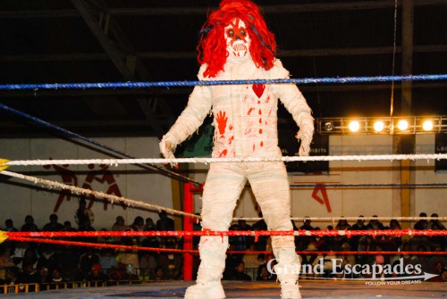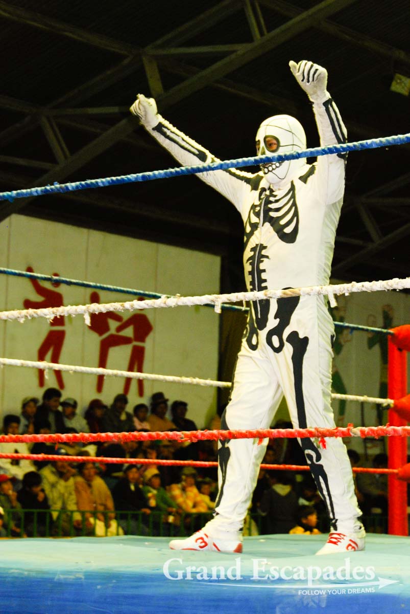 The venue is a multifunctional gym and the place was packed with local people who took this very serious. Some of the wrestlers are real celebrities and people hold out their kids to have a photo taking with them. All the wrestlers are clad in grotesque costumes, a mummy, a skeleton, a “Cholita”, a soldier… They are very athletic, otherwise them would not survive the constant banging of their bodies on the floor.