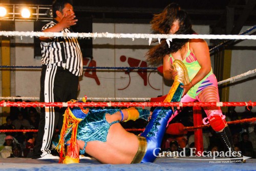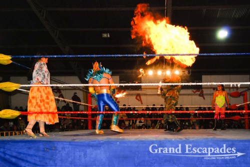 We went there because it is a real local event, but found it rather ridiculous watching people in disguise hitting each other. Even though most of it is show, injuries are common, like fractures or dislocated shoulders as the person sitting next to Heidi told her. In order to show disapproval visitors throw oranges, plastic bottles or the content of the bottles at the fighters, who then throw them back. This can turn into a messy affair, for instance the lens of our camera was sprayed with coca-cola, or especially when fighters leave the arena and continue their fight near or even inside the visitors’ area, which always causes major excitement.