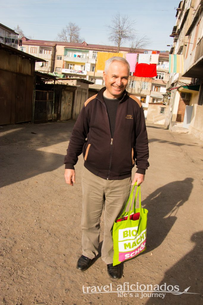 Khackik in front of the apartment building in Stepanerkert, where his cousin livesKhachik’ s cousin and wife in Stepanakert, both retired school teachers, also rent out a room of their apartment in Stepanakert. Eventually I was glad I had decided on the hotel in Sushi rather then cramp into an apartment with 5 people.