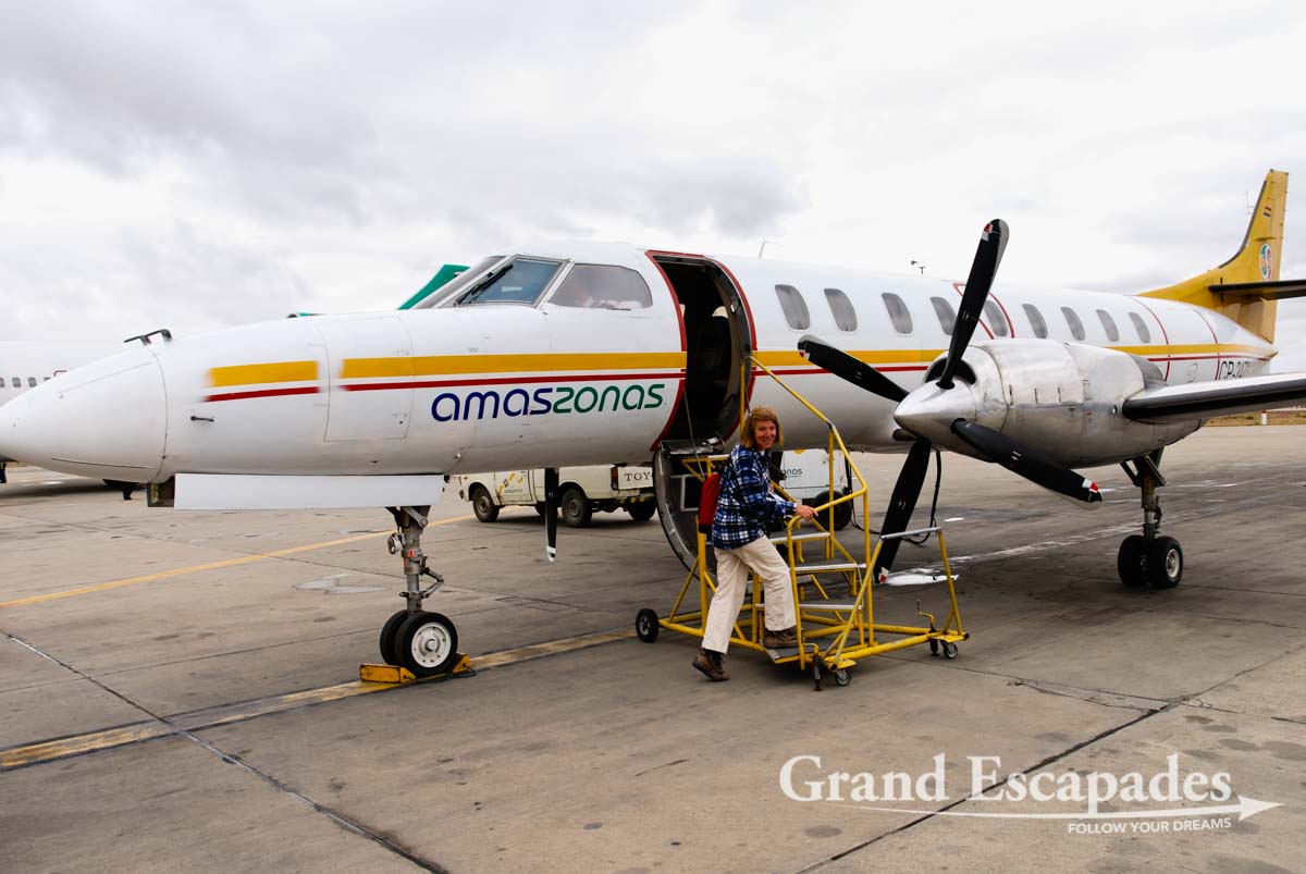 Today, October 17th, we happily boarded a tiny plane that would take us into the warmth of Bolivia’s Amazon Basin. Taking off from La Paz El Alto International Airport at 4.050 meters added to our excitement, but soon turned into a nerve racking journey. Due to bad weather the 40 minute trip to Rurrenabaque was more like a roller coaster ride. Heidi felt as if she had stopped breathing and stared at her watch counting the minutes to finally touch down.
